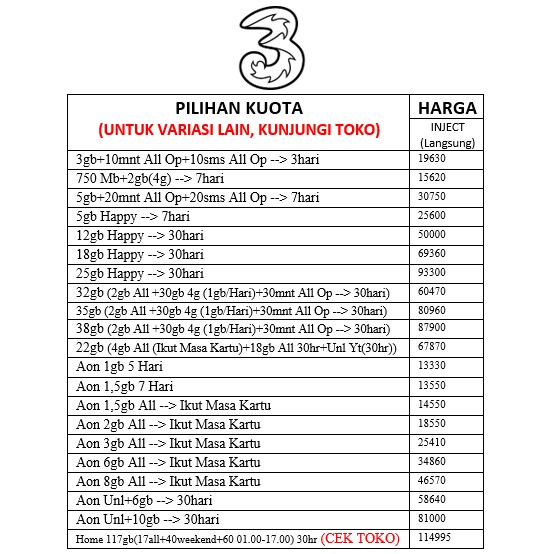 Produk data inject tri always on lama kode trdp per tanggal 2 januari voucher telkomsel jawa tengah vmjj1 v.tsel (jateng) 1.5gb+2gb lokal;7h 21.450 open vmjj3 v.tsel (jateng). Paket aon ini termurah 15.000 dan tidak diperpanjang otomatis. Agen paket data kuota telkomsel xl indosat smartfren axis bolt simpati loop as combo mania murah tips trik cara aktifkan internet murah pulsa , permaianan di sini saya menerima pendaftaran agen pulsa kuota internet , produk yang kita jual mencakup semua profider mulai dari telkomsel,xl,indosat,axis. Kita bisa inject kpk tri dengan beragam produk mulai dari perdana internet aon 12 bulan maupun cek harga aktivasi kpk tri terupdate gunakan format ketik : Hp) indosat super internet indosat yellow (kuota harian) voucher tri++ (call *111*sn#) indosat new freedom xl xtra combo axis supermini 5hari axis data mini tri mini indosat 1gb/hari tri. Kuota inject & voucher injek/tembak/isi ulang paket data indosat im3/mentari tersedia juga pulsa, kartu perdana & paket data lain. Inject kuota tri murah anda sedang mencari kuota internet murah? Mendapatkan kuota gratis 100 gb dari tri tentu bukan sesuatu yang mudah. Detail paket telkomsel combo sakti 15gb. Tri voucher kuota atdv1m=1.5gb 30hr lampung&bengkulu rp11.000. * 15gb + unlimited app, 30 hari > hanya @ 85rb. Tengkyu bos testinya cek kulkas ada yg segar2. • semua pelanggan tri indonesia akan mendapatkan penawaran produk ini.